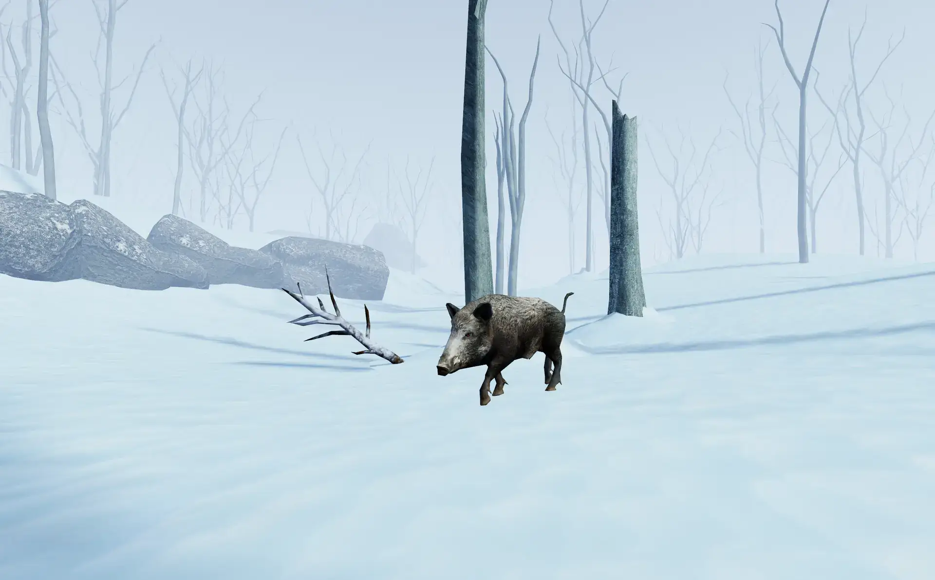 Tauche ein in eine verschneite Landschaft und mach dich bereit für rasante Manöver, während Wildschweine aus allen Ecken des Waldes auftauchen und deine Fähigkeiten und Präzision auf die ultimative Probe stellen.