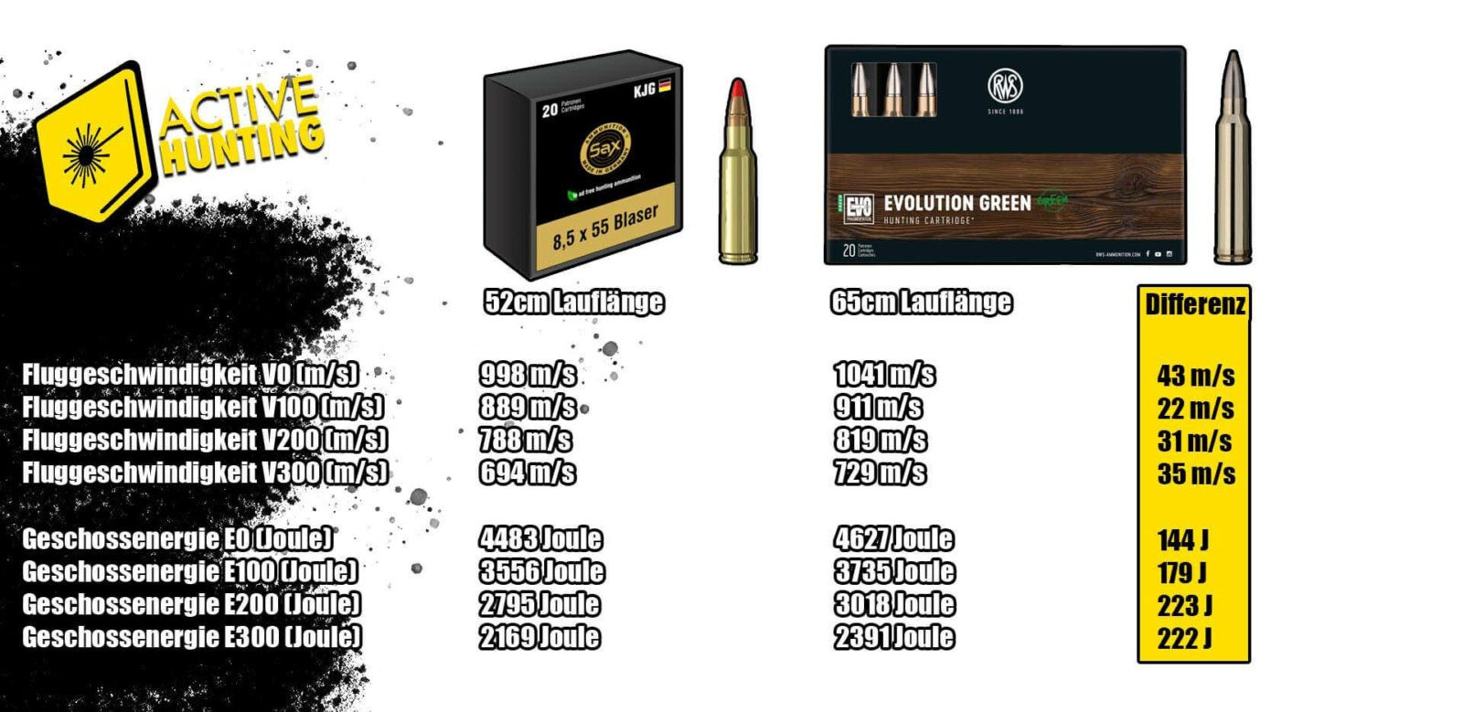 Die Unterschiede sind aus jagdlicher Sicht marginal und die 8,5×55 Blaser entfaltet nahezu die gleiche Geschwindigkeit und Energie wie eine .300 Win. Mag. verschossen aus einem 65cm langen Lauf.