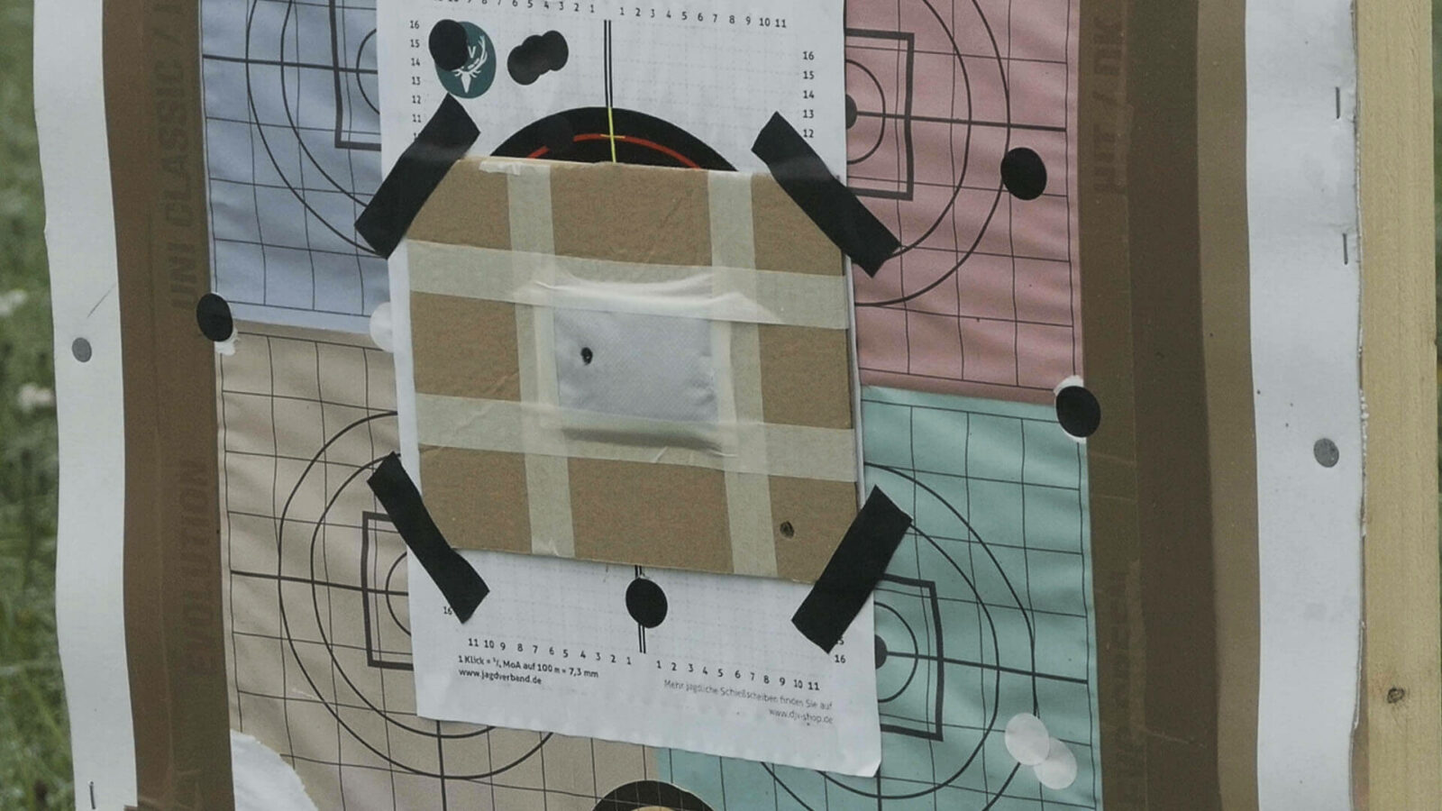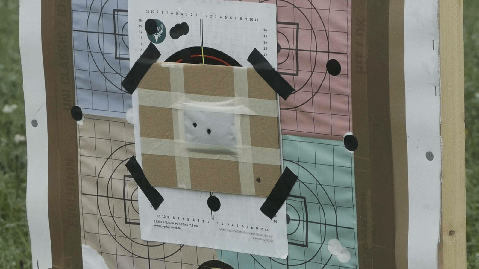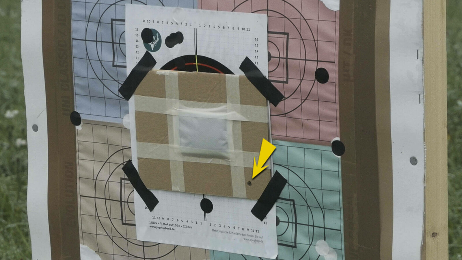 Wir korrigieren also nochmals einen Korrekturschritt nach rechts und geben einen weiteren Schuss ab, um zu sehen, ob die 3. Kugel mittig auf dem Wärmepad sitzt. Der 3. Schuss sitzt mittig auf dem Wärmepad und damit kann man definitiv jagen.
