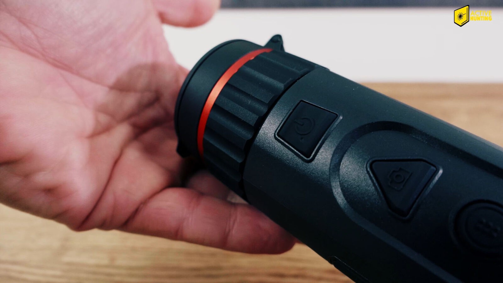 Das Gerät verfügt auf der Oberseite über 4 gut proportionierte Tasten, welche zur kompletten Steuerung ausreichen. Die Ein/Aus Taste, die Aufnahmetaste, die Menütaste und die Zoomtaste. Ebenso ist in der Ein/Aus Taste eine kleine LED integriert, welche in tiefer Nacht verrät, ob das Gerät ein oder ausgeschaltet ist. Zudem findet man in tiefer Nacht schnell die Taste, um das Gerät aus dem Standby Modus aufzuwecken. Die LED leuchtet äußerst dezent, was bei der Schwarzwildjagd ebenso von Vorteil ist.