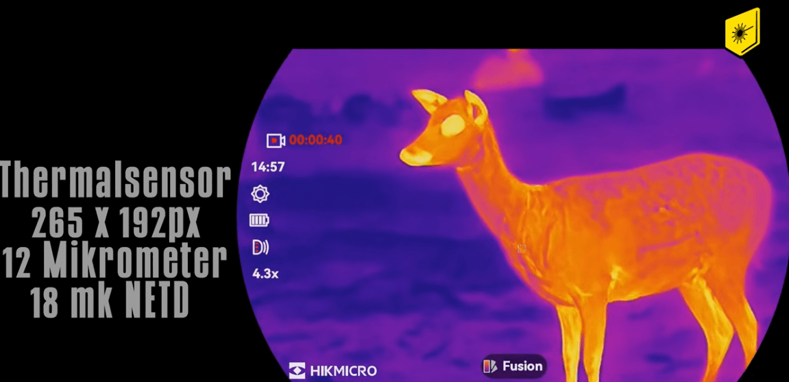 Der Tag- und Nachtsichtkanal verfügt über einen 4K auflösenden Sensor, der in Verbindung mit der 60 mm Linse ein Sehfeld von 12,8 m auf 100 m bietet. Der Vergrößerungsbereich umfasst hier 5,5 fach bis 22 fach. Damit eignet sich das neue Hikmicro HE25L 2.0 besonders für Jäger im Feld oder in gemischten Revieren sowie für die Kirrungsjagd. Für die Pirsch im Wald ist es aufgrund der hohen Grundvergrößerung und des kleinen Sensors weniger geeignet. Das Entdecken und Verfolgen von Wild wird bei der hohen Grundvergrößerung erschwert.