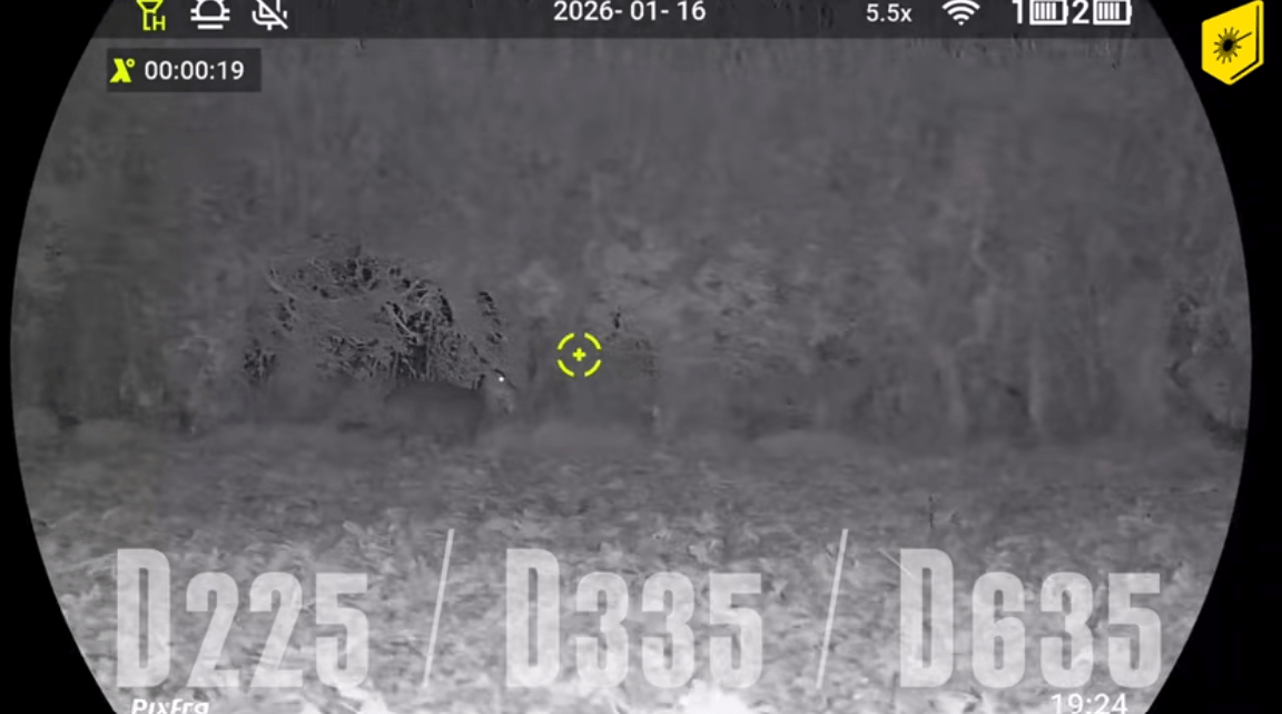Der Thermalkanal des D355 4K besitzt einen 384er Sensor, der in Kombination mit der 35 mm Brennweite ein Sehfeld von 13,7 m auf 100 m bietet. Der Vergrößerungsbereich umfasst eine 3,8 fache bis 30,4 fache Vergrößerung. Die höhere Auflösung und der im Vergleich zum D225 mit 15 mK empfindlichere Sensor führen zu einer deutlich besseren Bilddarstellung. Das D335 4K bleibt unter der 2000€ Marke: 1899 € ruft der Hersteller für dieses Gerät auf.