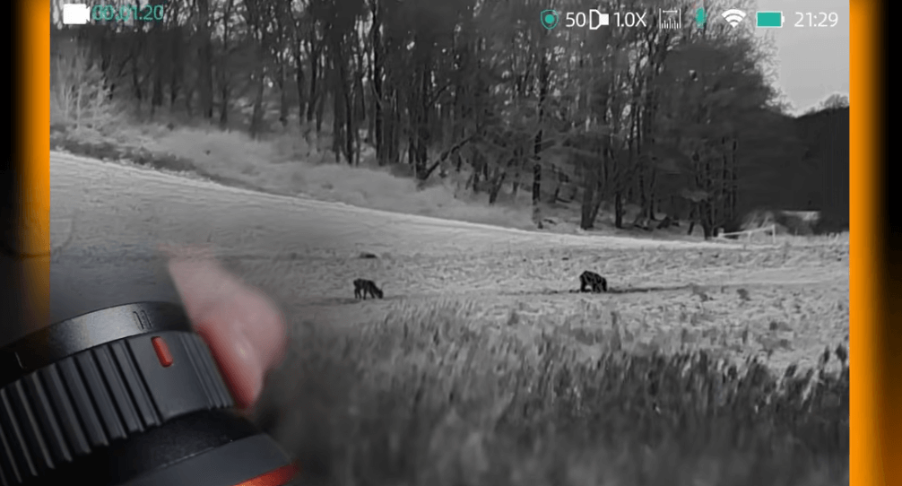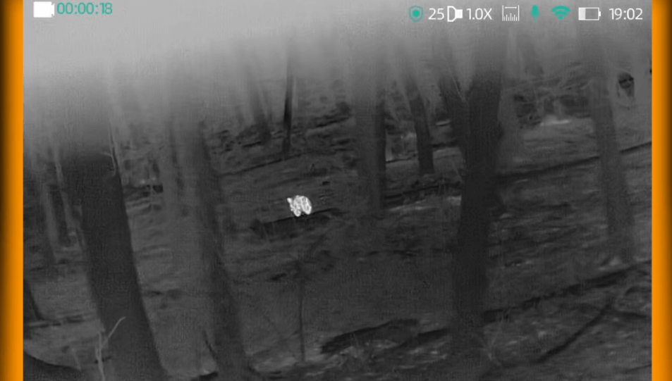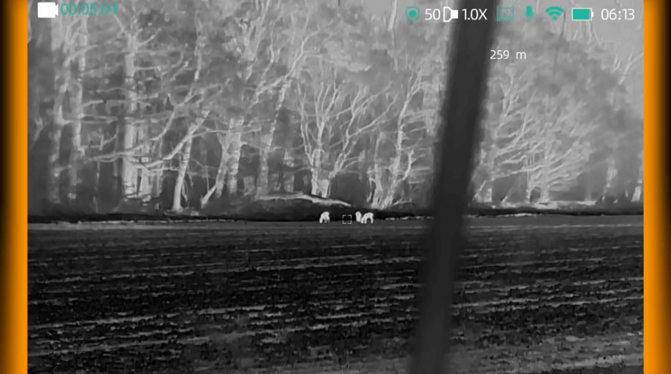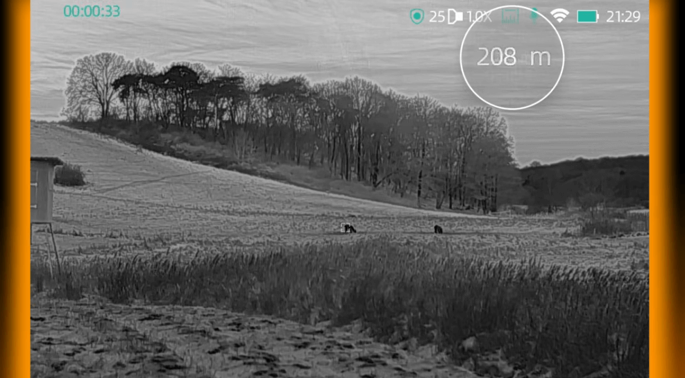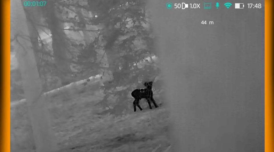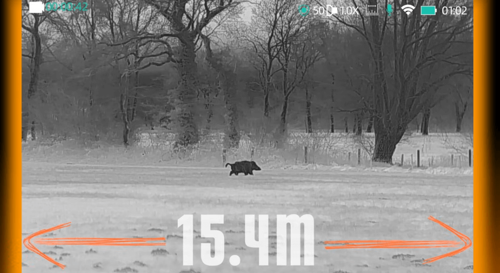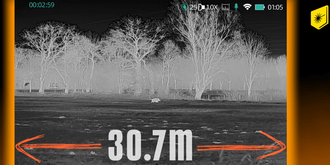 Mit der 50 mm Brennweite steht dir ein Sehfeld von 15 m auf 100 m zur Verfügung. Mit dem Laserentfernungsmesser kannst du nun direkt ermitteln, wie weit die Wärmequelle entfernt ist.